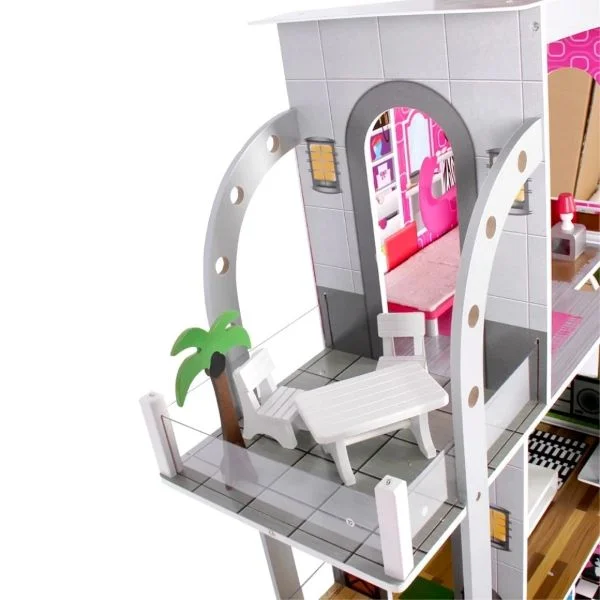 - The wooden modern doll house is made of natural wood, features tough and durable wood.