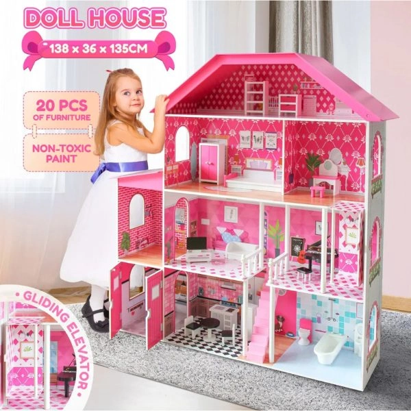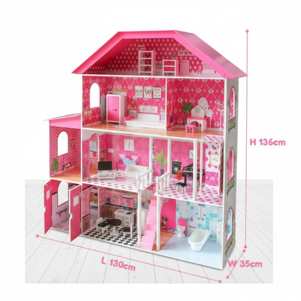 Fully furnished dollhouse with staircase, balcony, piano, and other furniture