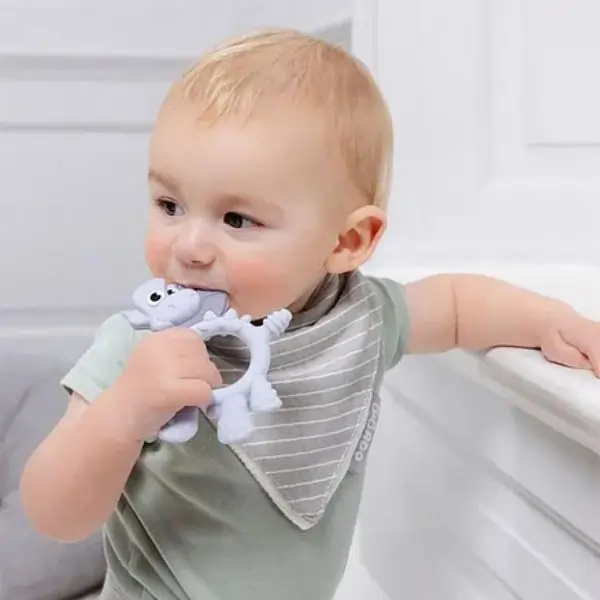 The Bibado Dotty Dinosaur Teether in Mist is designed for babies 3 months and older. Its multi-sensory design strengthens mouth muscles, supports sensory development, and encourages independent play. The easy-grip shape is perfect for little hands, making teething a safe and enjoyable experience.
