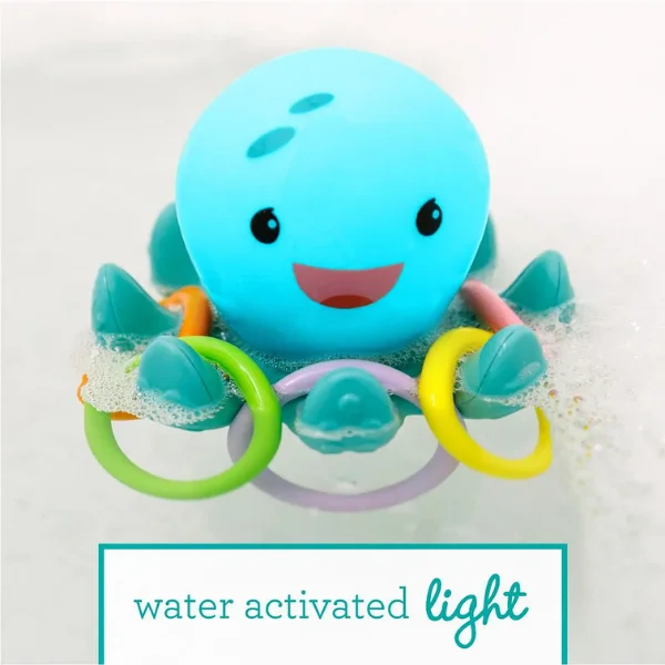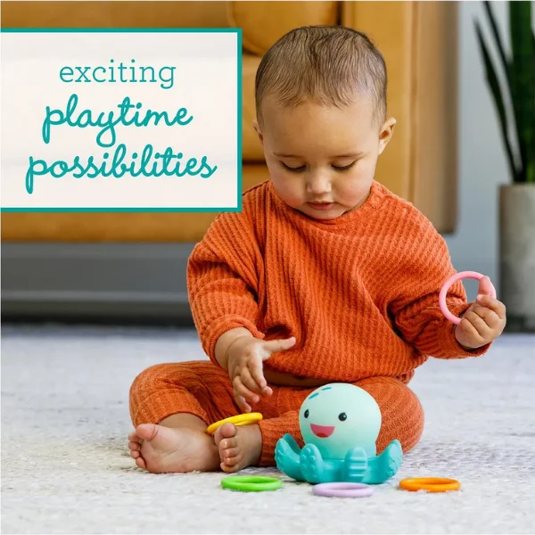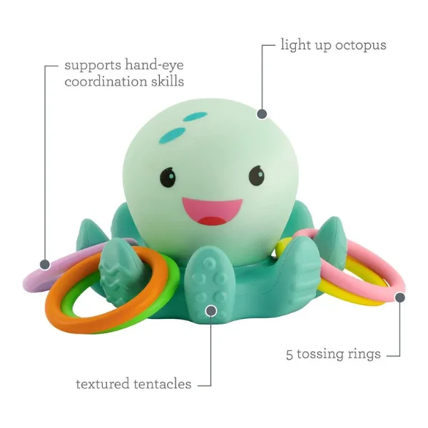 Catch the glow with the Infantino Light Up Ring Catcher—an illuminating octopus toy for 0 months+ that lights up when shaken or tapped, encouraging tactile exploration and sensory play. Toss the 4 colorful soft plastic rings onto the octopus arms to hear fun sounds and see motion-activated lights. Perfect size (12 x 10 cm) for little hands, it promotes hand-eye coordination and cause-and-effect learning. Non-toxic plastic is safe and durable; easy to clean. EN certified for safety. Ideal for UAE tummy time or travel. Ships in 2 days via YallaBuyIt.ae.
