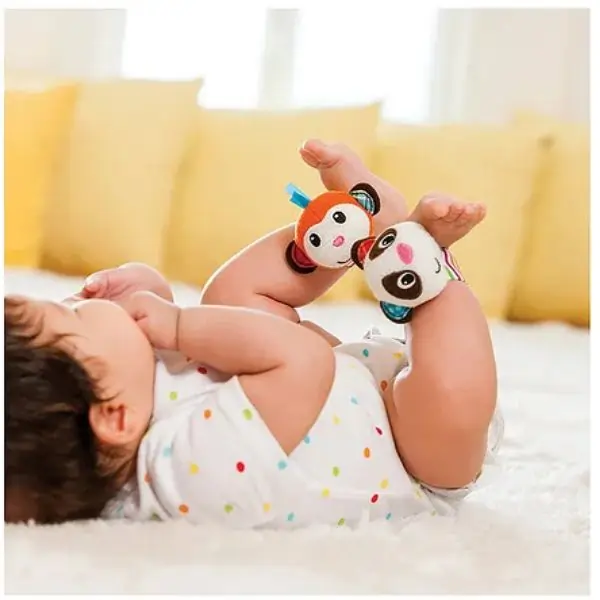 Includes 2 soft plush wrist rattles (Monkey & Panda)