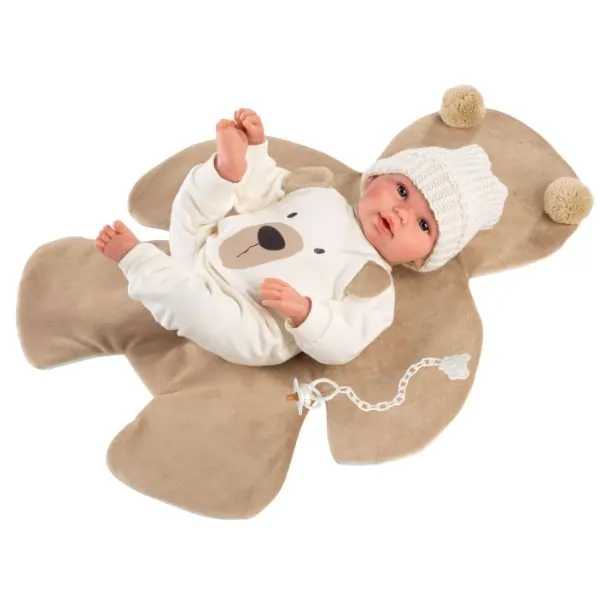 Experience lifelike play with the Llorens Newborn Crying Doll 36cm — a beautifully crafted RN-style baby doll with a soft cuddly body and realistic details. Press the tummy to hear gentle crying sounds, then use the pacifier to soothe the doll just like a real newborn. Dressed in a cozy brown bear outfit, this doll is perfect for imaginative play, emotional development, and display. Handmade in Spain by Llorens, the doll features premium materials, a soft vinyl face and limbs, and careful finishing for long-lasting quality and safety.
