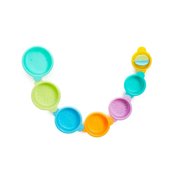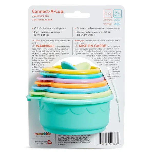 Splash and learn with the Munchkin Connect A Cup—a 7-piece set of colorful stacking cups that connect, scoop, and sprinkle water for 9 months+. Sort by size to build math awareness, use the spinner cup for fun water effects, and observe flow for cause-and-effect lessons. Made from durable, BPA-free plastic for safety and easy dishwasher cleaning. EN certified for peace of mind, the set fits small hands and encourages creative bath play. Ideal for UAE water fun. Ships in 2 days via YallaBuyIt.ae. Key Specifications: