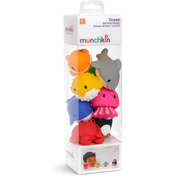Dive into bath time adventures with the Munchkin Ocean™ Bath Squirts (Pack of 8)—soft, floating squirters featuring endangered ocean friends like pufferfish, penguin, jellyfish, seahorse, starfish, octopus, dolphin, and shark for 9 months+. Fill and squeeze to squirt water, developing fine motor skills and encouraging pretend play while learning animal names. Made from phthalate-free, PVC-free, latex-free rubber (BPA-free) for safety and teething. Each brightly colored toy floats and is sized for little hands; dishwasher-safe and quick-drying. EN certified for peace of mind. Perfect for UAE splashy fun. Ships in 2 days via YallaBuyIt.ae. Key Specifications: