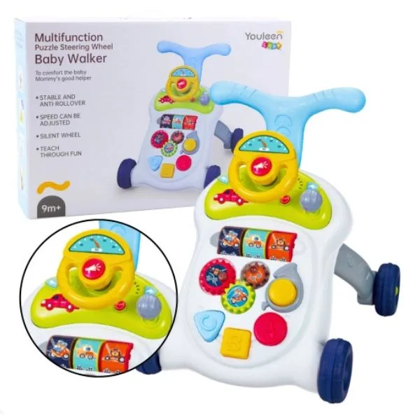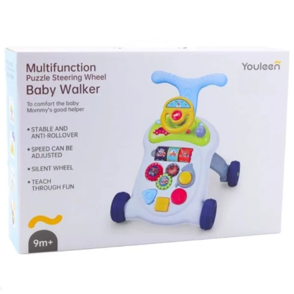 Youleen Multifunction Baby Walker is a versatile sit-to-stand learning walker designed to support babies during their early walking and development stages. Suitable for babies aged 9 months and above, this interactive walker combines mobility support with engaging learning activities. The front activity panel includes puzzle elements, a steering wheel, and interactive play features that encourage sensory exploration, coordination, and problem-solving skills. As babies grow, the walker helps strengthen leg muscles, balance, and confidence while promoting independent movement. The sturdy design ensures stability during first steps, while colorful learning activities keep little ones entertained and engaged.