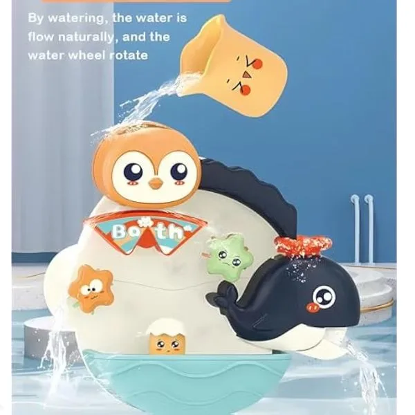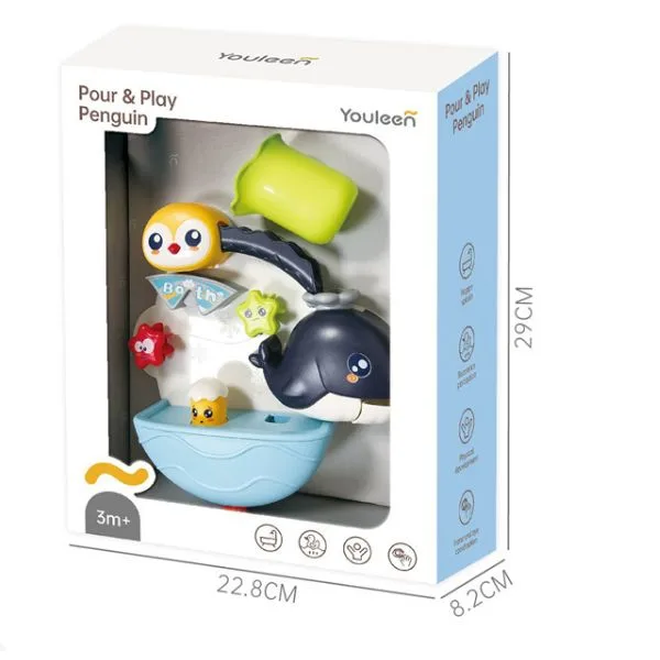 Youleen Animal Bath Toy Set – Penguin Waterfall Bathtub Toy. Specially designed for babies 3 months and above, this interactive bath toy transforms ordinary baths into fun learning and sensory play sessions. The adorable penguin waterfall design allows water to flow through spinning wheels and sea animal elements, creating movement, sound, and visual stimulation that keeps babies engaged while bathing. Simply attach the toy to bathroom walls or bathtubs using strong suction cups and let toddlers explore pouring, spinning, and water play. This bath toy encourages hand-eye coordination, sensory development, and early learning, helping children build confidence and independence during bath time while reducing fear of water. Perfect for bathtubs, showers, pools, or water play areas.