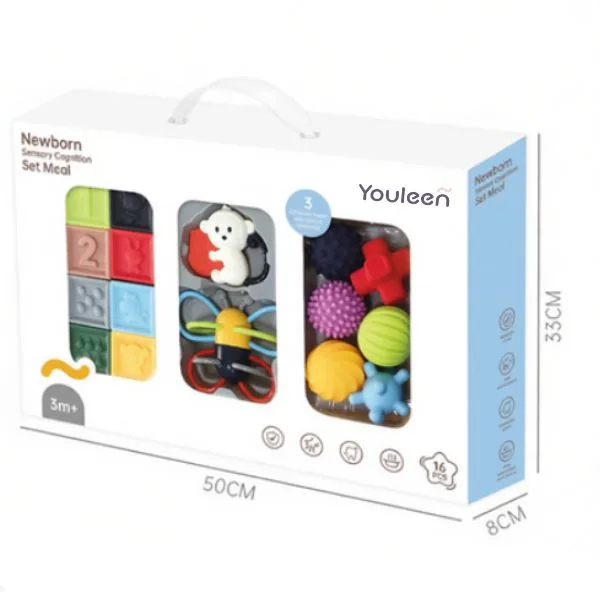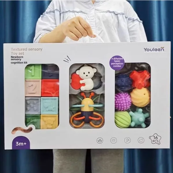 Youleen Newborn Sensory Toy Kit, specially designed for infants 3 months and above. This developmental toy set features high-contrast black and white patterns that help stimulate newborn vision and promote early brain development. During the first months of life, babies respond strongly to bold contrasting colors. The sensory toys encourage visual tracking, tactile exploration, and sensory awareness while improving focus and cognitive skills. The kit includes multiple engaging elements designed to support sensory stimulation, hand coordination, and early discovery, making it an ideal learning companion for tummy time, crib play, stroller use, or interactive parent-baby bonding sessions. Perfect as a newborn gift, baby shower present, or early developmental learning toy.