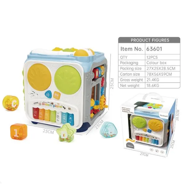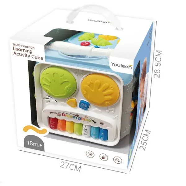 Youleen Multifunctional Educational Cube for Toddlers. Designed for children 18 months and above, this interactive activity cube offers multiple sides of engaging play that support cognitive growth and motor skill development. Each side of the cube features different educational activities including buttons, spinning elements, shape learning, music, and light effects that stimulate sensory exploration. The lights and sounds keep toddlers entertained while helping them learn colors, shapes, coordination, and problem-solving skills. Compact, colorful, and educational, this multifunctional cube transforms playtime into a fun learning experience for growing toddlers.