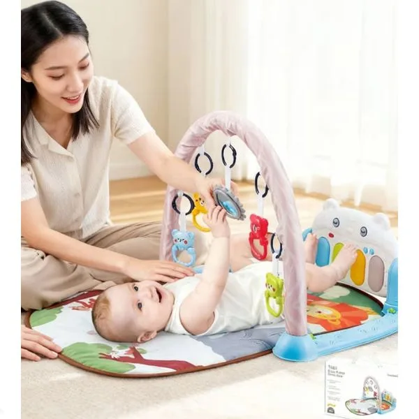 Youleen Baby Gym Musical Play Mat is an interactive early-learning activity center designed to support babies’ physical, sensory, and cognitive development from newborn stages through toddlerhood. This multifunctional kick & play piano gym combines music, movement, and play to keep babies engaged while encouraging natural development. The soft padded mat provides a comfortable surface for tummy time, while the detachable hanging toys and musical piano stimulate visual tracking, grasping skills, and motor coordination. Babies can kick the piano keys to activate melodies and sounds, helping them learn cause-and-effect while strengthening leg muscles. Made with non-toxic, baby-safe materials, this colorful activity gym creates a safe indoor play environment perfect for everyday learning and fun.