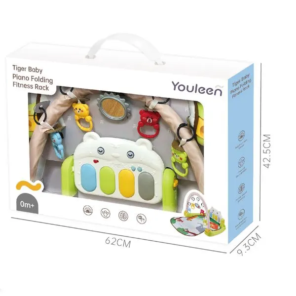 Youleen Tiger Baby Piano Folding Fitness Rack is an interactive musical play gym specially designed to support newborn development through movement, sound, and sensory play. Perfect for babies from birth onwards, this colorful fitness rack combines a soft play area with a musical piano and engaging hanging toys to encourage early exploration. Babies can kick the piano keys to activate lights and cheerful melodies, helping strengthen leg muscles while improving coordination and sensory awareness. The foldable design makes it convenient for storage and travel, while the playful tiger theme creates a fun and stimulating environment for growing infants. Ideal for tummy time, kick play, and early learning activities, this baby gym supports developmental milestones during the first year.