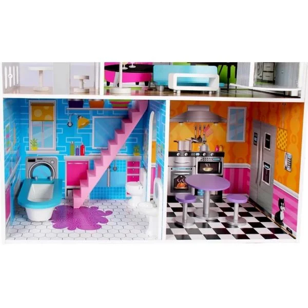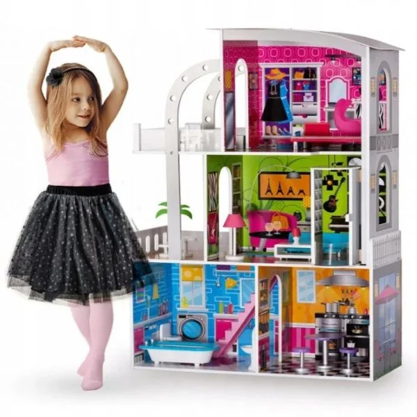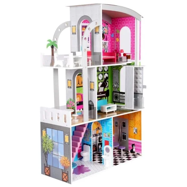 - The wooden modern doll house is made of natural wood, features tough and durable wood.