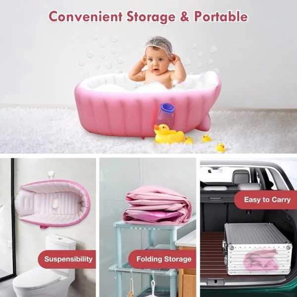 Lightweight and foldable, it inflates quickly and stores easily, making it an ideal solution for parents who need a compact bath tub for daily use, vacations, or outdoor trips. It can also be used as a mini water play pool for supervised fun.