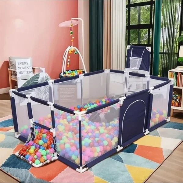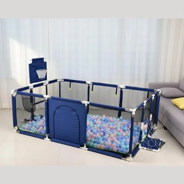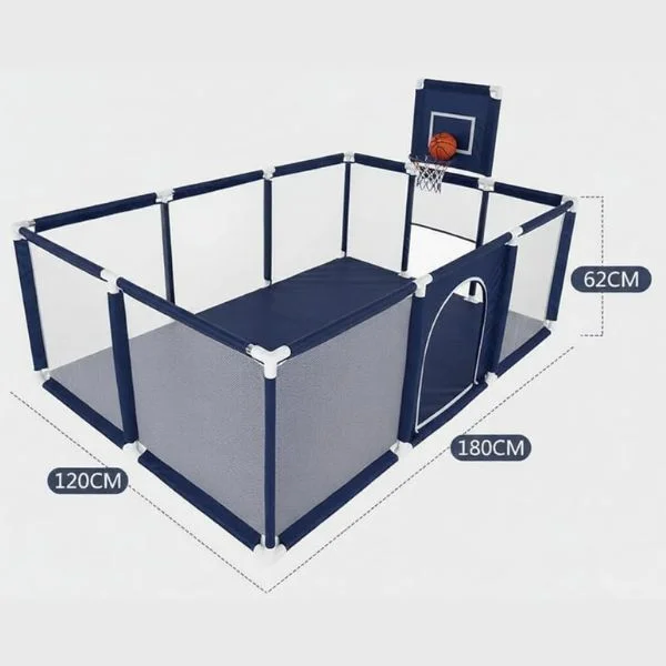 Equipped with a basketball hoop and soccer net, this playpen encourages active play and motor skill development. The breathable mesh panels allow full visibility for parents while ensuring proper airflow. A convenient zipper door makes it easy for kids to enter and exit safely. Suitable for both indoor and outdoor use, this navy blue playpen is ideal for homes, gardens, and playrooms.