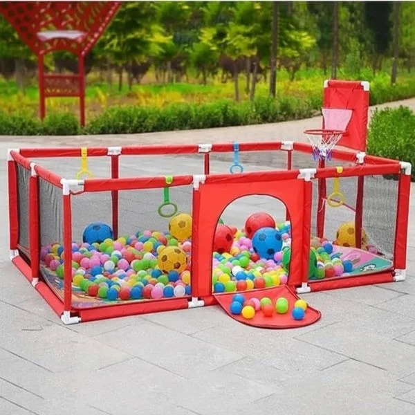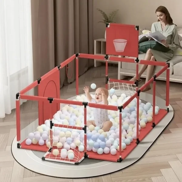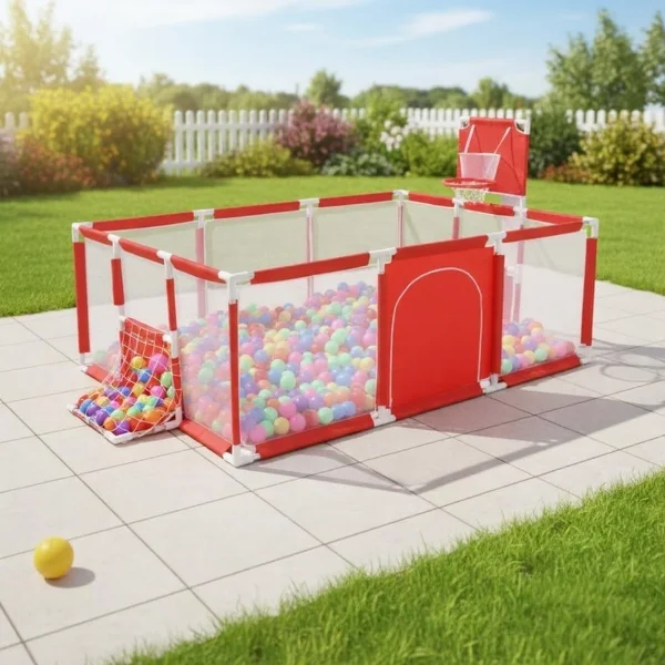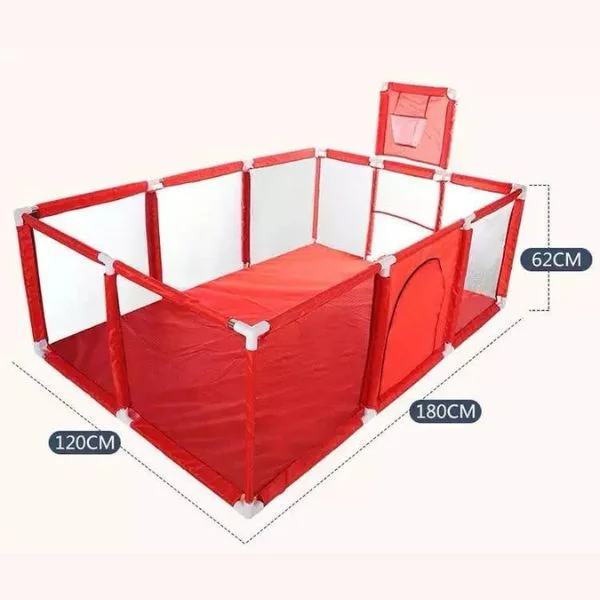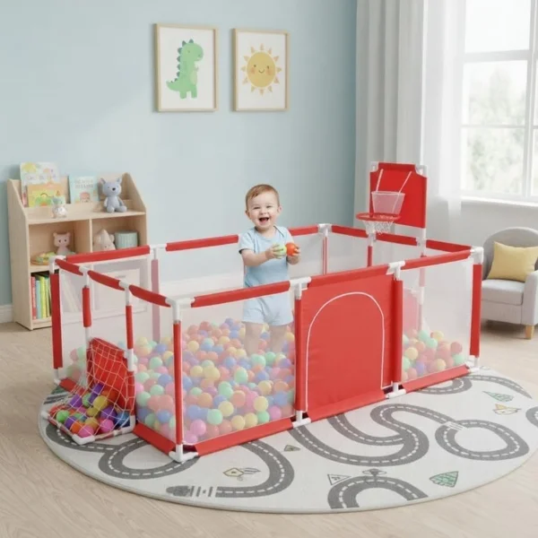 Equipped with a basketball hoop and soccer net, this playpen encourages active play and motor skill development. The breathable mesh panels allow full visibility for parents while ensuring proper airflow. A convenient zipper door makes it easy for kids to enter and exit safely. Suitable for both indoor and outdoor use, this red playpen is ideal for homes, gardens, and playrooms.