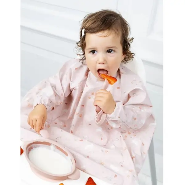 The Bibado Long Sleeve Coverall Weaning Bib in the Botanical Bunnies Pink design is the perfect mealtime solution for busy parents. Designed for babies aged 6 months to 3 years, this bib provides complete waterproof coverage to keep your little one’s clothes clean and dry. The soft, breathable fabric ensures comfort during feeding, while the long sleeves and adjustable straps offer full protection and a secure fit. With its adorable bunny print, it turns messy mealtimes into fun, colorful experiences.