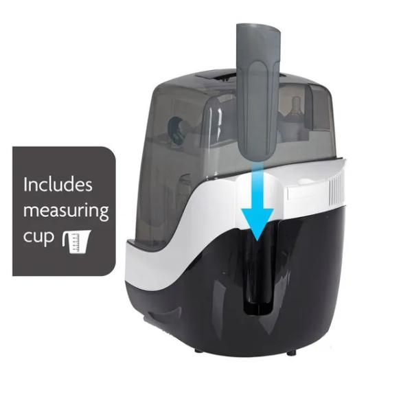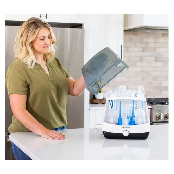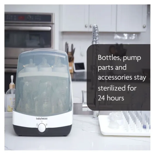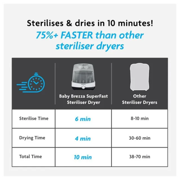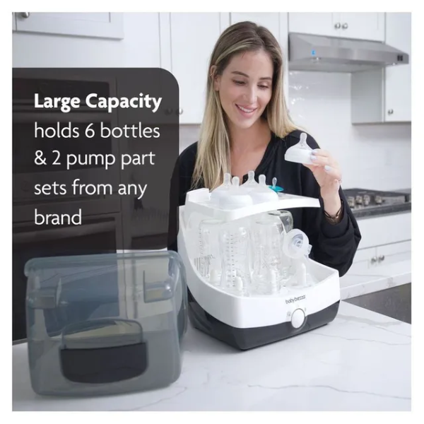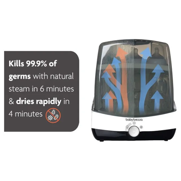 Sterilize and dry in record time with the Baby Brezza 10 Minute Sterilizer + Dryer in white—75% faster than competitors, using electric steam to kill 99.9% germs (including thrush-causing yeast) in 6 minutes, then dries in 4 minutes with hot air. Fits 6 bottles, pacifiers, or breast pump parts from any brand (plastic, glass, silicone). Choose 4 modes (Sterilize & Dry, Sterilize Only, Dry Only, Storage) via one-button control. BPA-free, EN certified, with stainless steel plate, measuring cup, and auto shut-off for safety. Compact (34.2x32x38.3 cm, ~4 kg), it's ideal for UAE kitchens. Ships in 2 days via YallaBuyIt.ae.