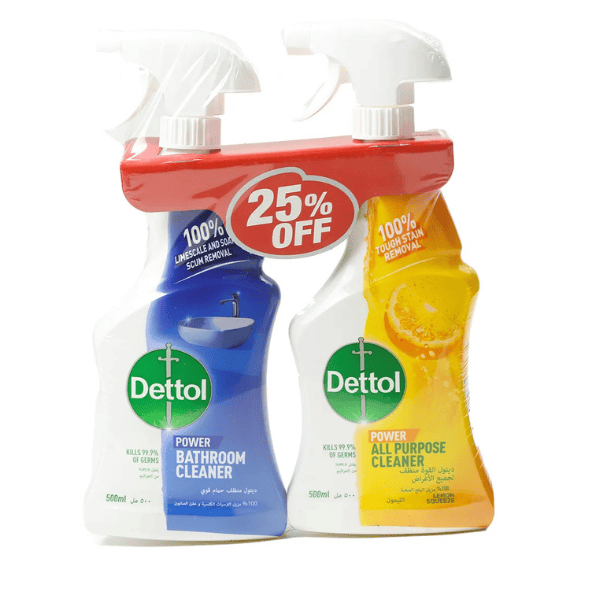 Includes Dettol All Purpose Cleaner Lemon + Bathroom Cleaner Original (500ml each).