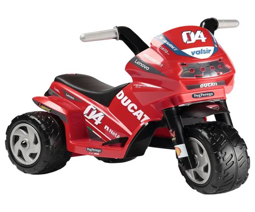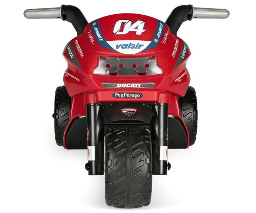 Ducati Mini EVO, maxi fun! The electric motorcycle for children with lights and sounds. You never forget your first Ducati motorcycle, especially when it's this special. Ducati Mini EVO shows its extraordinary "EVOlution" with its even higher-performing characteristics. Lights, sounds, tunes, a horn and all the safety of Italian materials, for great fun from the age of 1. The electric motorcycle operates with a 6V/4.5Ah/25Wh rechargeable battery.