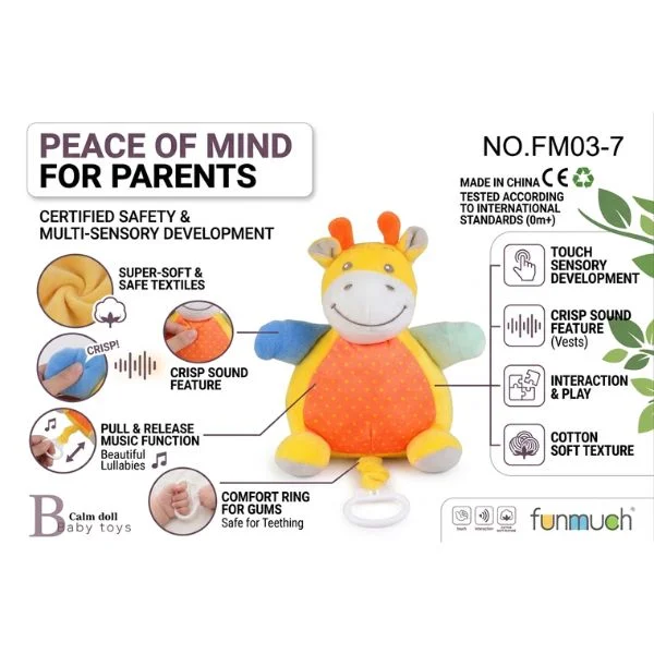 The Funmuch Baby Little Soothing Giraffe Toy is a soft and comforting musical plush designed to calm and entertain newborns and infants. Featuring a gentle built-in sound, this adorable giraffe toy helps soothe babies during rest time, playtime, or travel. Made with soft, baby-friendly fabric, it provides a cozy companion for cuddling while supporting early sensory development. The lightweight design makes it easy for little hands to hold, and the washable material ensures convenient everyday care. Perfect as a newborn essential or baby shower gift, this musical plush combines comfort, sound stimulation, and adorable design in one soothing toy.