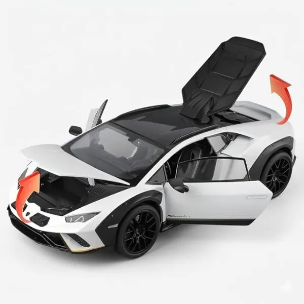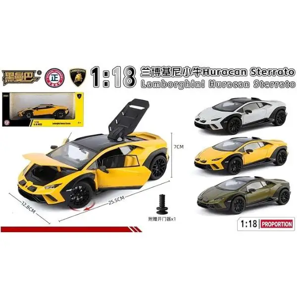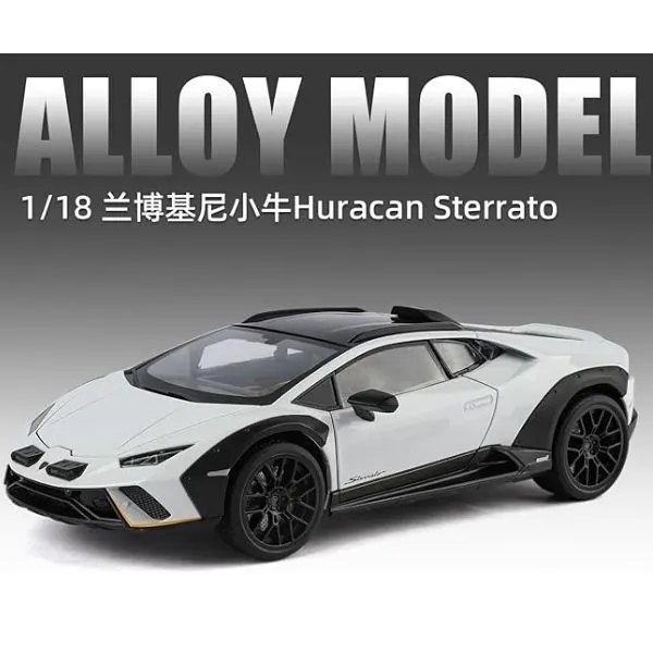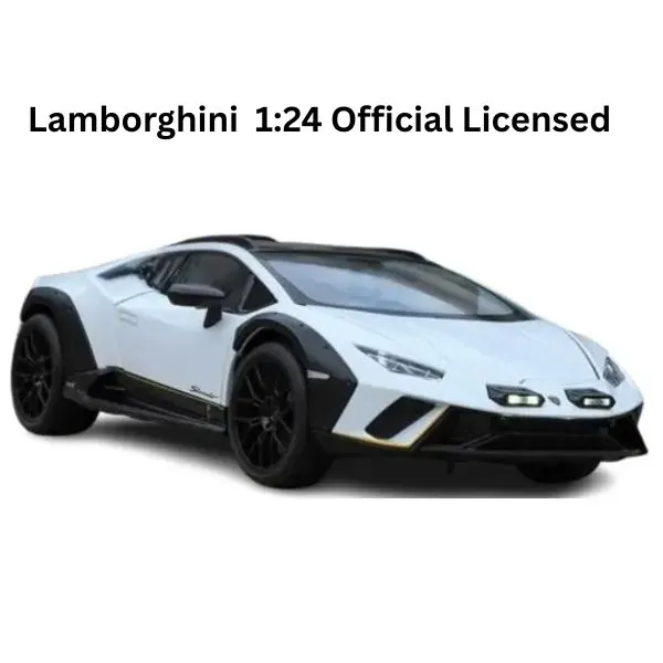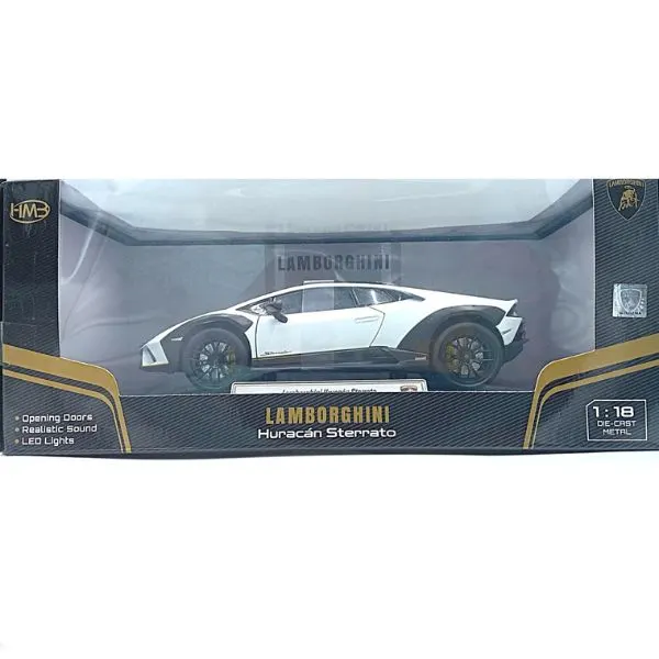 Lamborghini Official Licensed Huracán Sterrato 1:18 Diecast Model Car (White) is a premium collectible replica inspired by Lamborghini’s adventurous off-road supercar. Crafted in a detailed 1:18 scale, this diecast model recreates the bold design, raised suspension styling, and rugged supercar presence of the Huracán Sterrato. The elegant white finish highlights the vehicle’s sharp body lines and aggressive stance, making it an eye-catching addition to any model car collection. Constructed with durable alloy metal, the model features opening doors, realistic sound effects, and LED light functions, bringing the supercar to life with interactive details. A finely detailed interior, authentic body proportions, and smooth rolling wheels provide both collector-grade craftsmanship and engaging play value. Perfect for collectors, display cabinets, office décor, or as a premium gift for kids and adults who admire Lamborghini’s high-performance supercars.