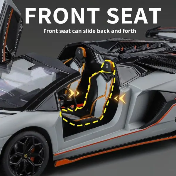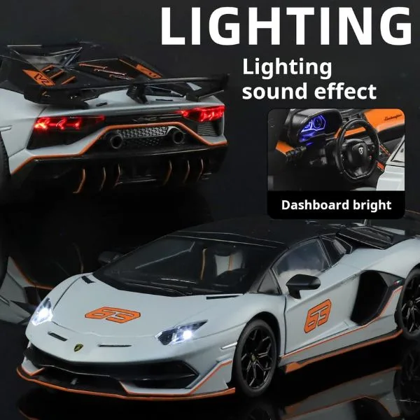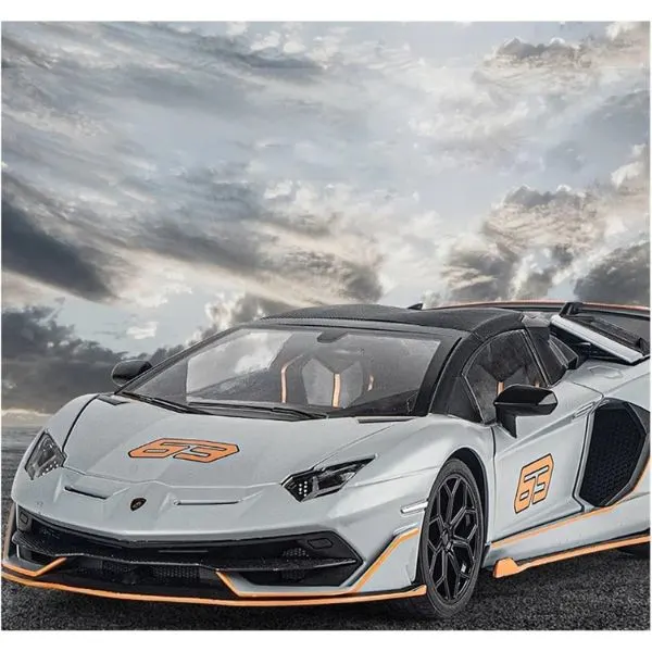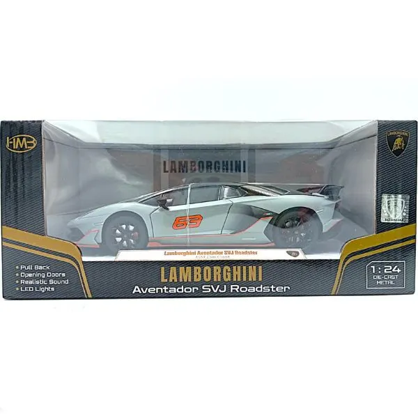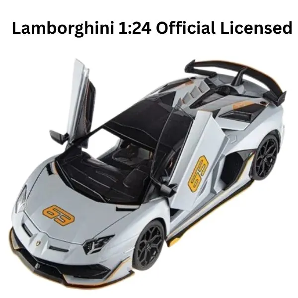 Lamborghini Official Licensed Aventador SVJ 63 Roadster 1:24 Diecast Model Car (Gray) is a premium collectible replica inspired by one of Lamborghini’s most exclusive and high-performance supercars. Crafted in a detailed 1:24 scale, this diecast model highlights the aggressive styling, aerodynamic body lines, and bold design of the Aventador SVJ 63 Roadster. The sleek gray finish enhances the supercar’s modern and sophisticated appearance, making it a standout display piece for collectors and supercar enthusiasts. Constructed with durable alloy metal, the model features opening doors, realistic sound effects, and LED light functions, adding interactive realism to the display. With a finely detailed interior, authentic body proportions, and smooth rolling rubber tires, this diecast model offers both collector-quality craftsmanship and engaging play value. Perfect for collectors, display cabinets, office décor, or as a premium gift for kids and adults who admire Lamborghini’s legendary supercars.