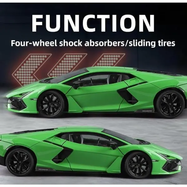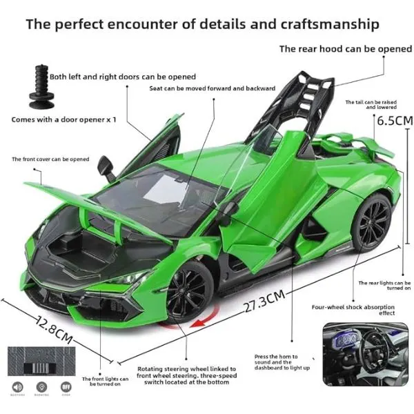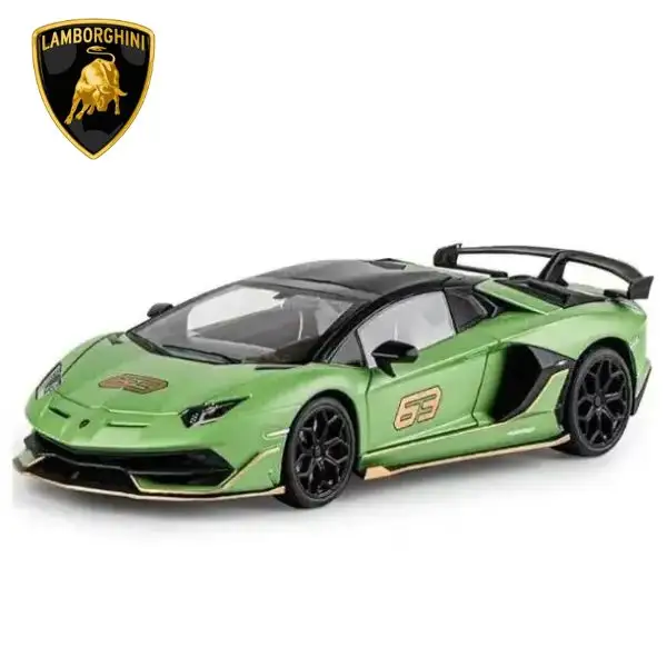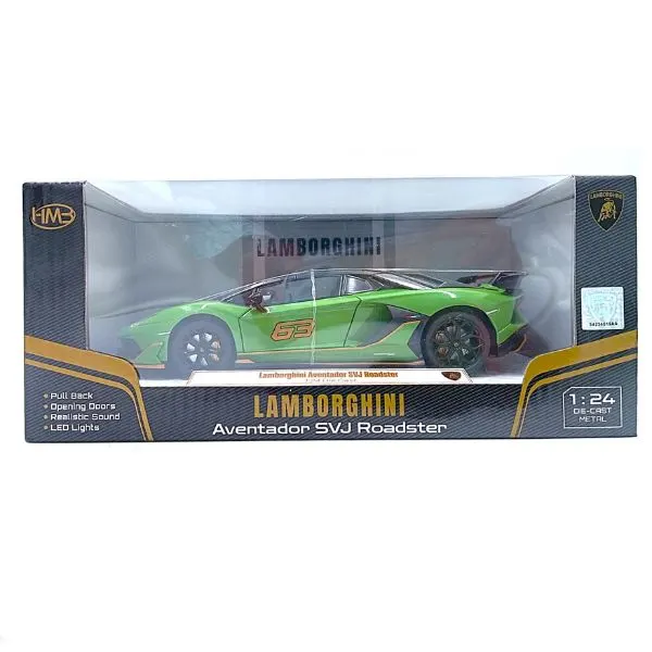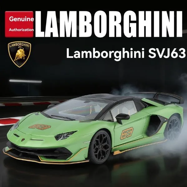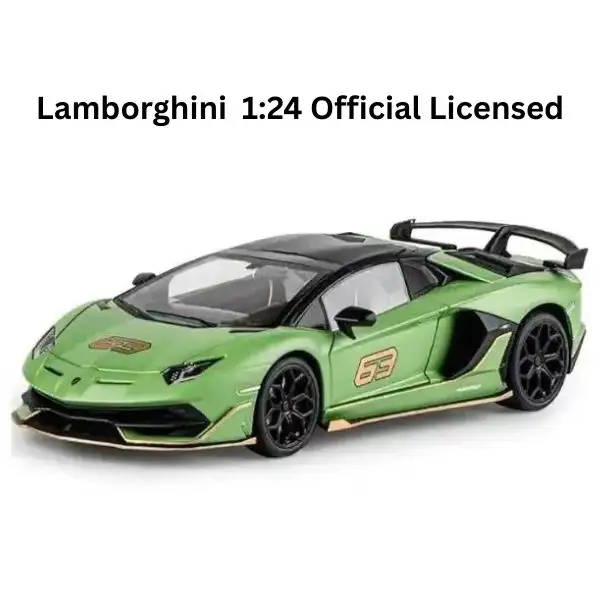 Lamborghini Official Licensed Aventador SVJ 63 Roadster 1:24 Diecast Model Car (Green) is a premium collectible replica inspired by one of Lamborghini’s most exclusive and high-performance supercars. Crafted in a detailed 1:24 scale, this diecast model showcases the aggressive styling, aerodynamic body design, and bold presence of the Aventador SVJ 63 Roadster. The vibrant green finish enhances the supercar’s sporty character, making it a striking display piece for collectors and supercar enthusiasts. Constructed with durable alloy metal, the model features opening doors, realistic sound effects, and LED light functions, bringing the supercar to life with interactive features. With a detailed interior, authentic body proportions, and smooth rolling rubber tires, this diecast model offers both collector-quality craftsmanship and engaging play value. Perfect for collectors, display cabinets, office décor, or as a premium gift for kids and adults who admire Lamborghini’s legendary supercars.