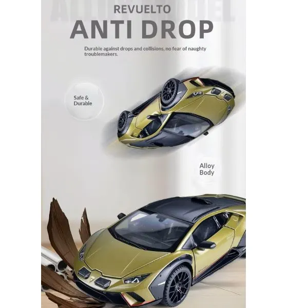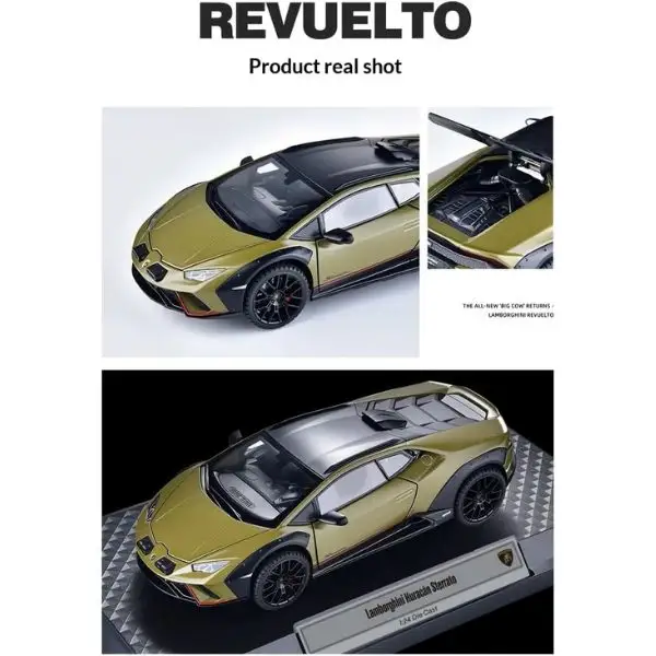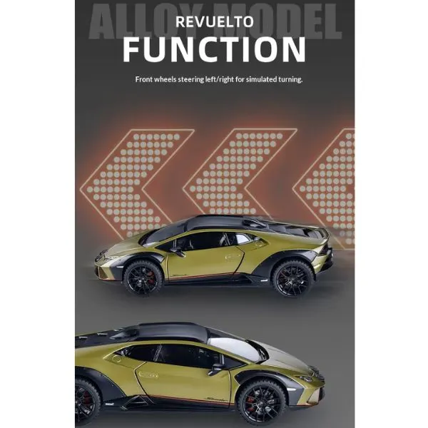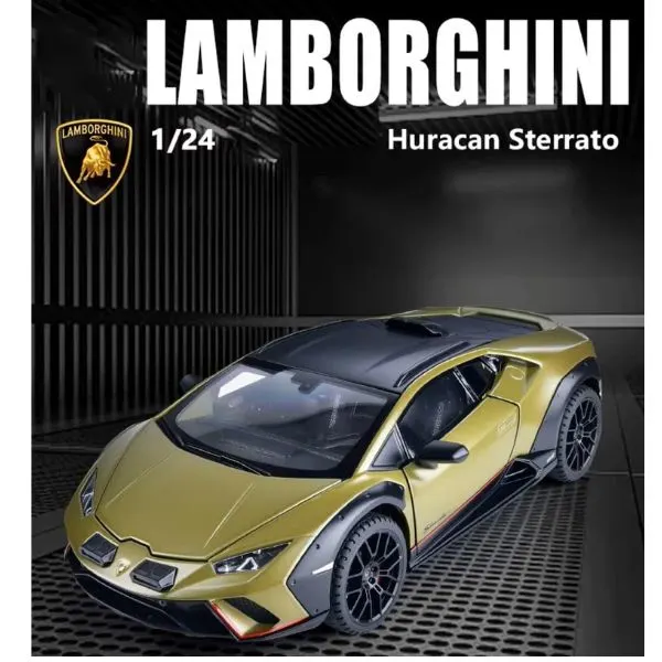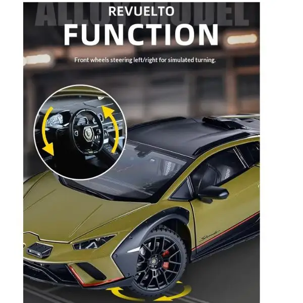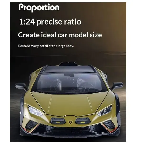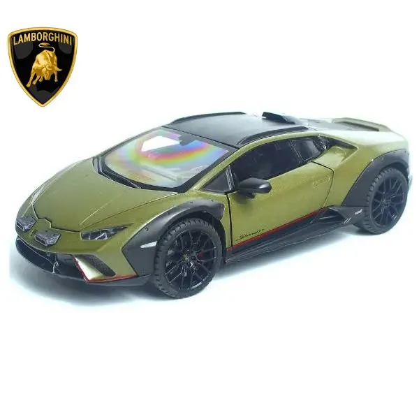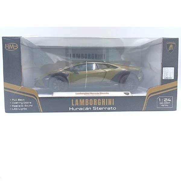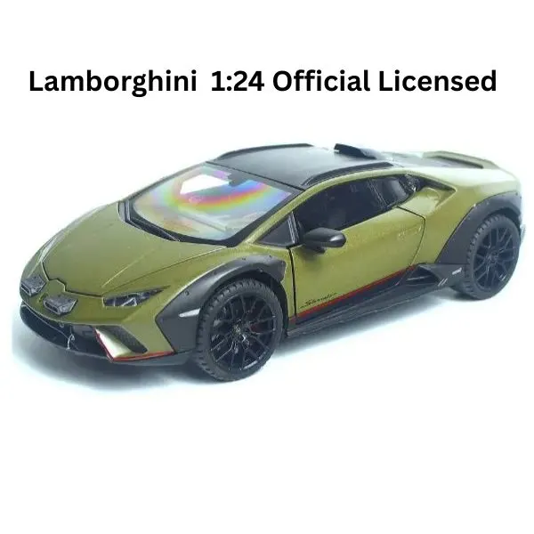 Lamborghini Official Licensed Huracán Sterrato 1:24 Diecast Model Car (Green) is a premium collectible replica inspired by Lamborghini’s adventurous off-road supercar design. Built in a detailed 1:24 scale, this diecast model captures the aggressive styling, raised suspension design, and rugged personality of the Huracán Sterrato. The vibrant green finish highlights the supercar’s bold and sporty character, making it a striking addition to any model car collection. Constructed from durable alloy metal, the model features opening doors, realistic sound effects, and LED light functions, creating an interactive and realistic experience. With a finely detailed interior, authentic body proportions, and smooth rolling wheels, this diecast model delivers both collector-quality craftsmanship and engaging play value. Perfect for collectors, display cabinets, office décor, or as a premium gift for kids and adults who admire Lamborghini’s high-performance supercars.