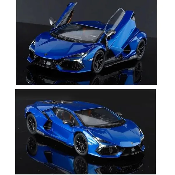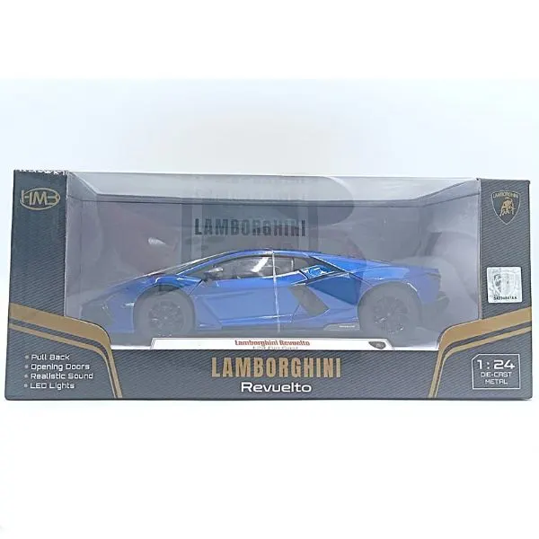 Lamborghini Official Licensed Revuelto 1:24 Diecast Model Car (Blue) is a premium collectible replica inspired by Lamborghini’s revolutionary hybrid V12 supercar. Crafted in a detailed 1:24 scale, this diecast model showcases the futuristic styling, sharp aerodynamic lines, and bold design of the Lamborghini Revuelto. The striking blue finish enhances the supercar’s dynamic and modern appearance, making it a standout display piece for collectors and automotive enthusiasts. Constructed with durable alloy metal, the model features precision exterior detailing, a realistic interior, and authentic body proportions that reflect Lamborghini’s advanced engineering and design philosophy. Perfect for collectors, display cabinets, office décor, or as a premium gift for supercar fans.