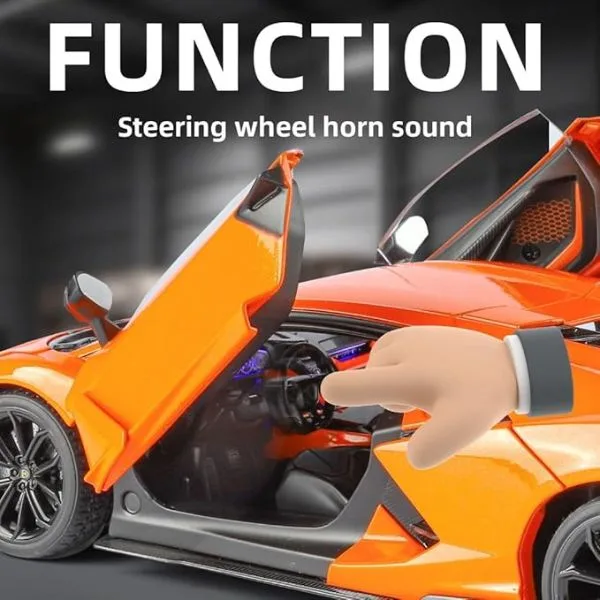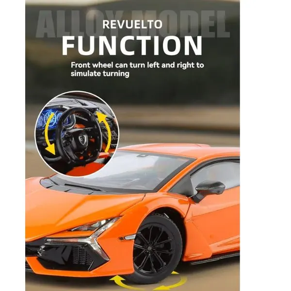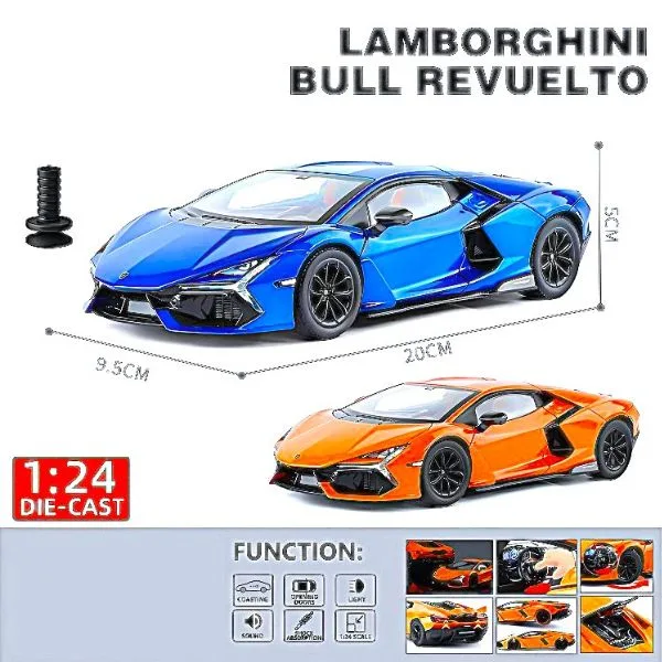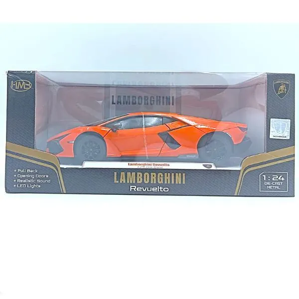Lamborghini Official Licensed Revuelto 1:24 Diecast Model Car (Orange) is a premium collectible replica inspired by Lamborghini’s revolutionary hybrid V12 supercar. Crafted in a detailed 1:24 scale, this diecast model recreates the futuristic design, sharp aerodynamic lines, and aggressive stance of the Lamborghini Revuelto. The vibrant orange finish enhances the supercar’s bold and dynamic appearance, making it a standout display piece for collectors and automotive enthusiasts. Built with durable alloy metal construction, the model features precise exterior detailing, a realistic interior, and authentic body proportions that capture the essence of Lamborghini’s next-generation supercar design. Ideal for collectors, display cabinets, office décor, or as a premium gift for supercar fans.