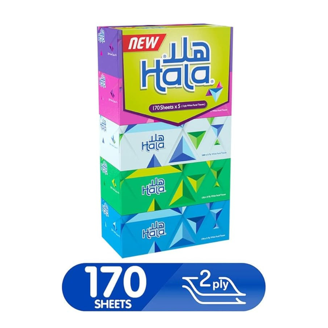 Experience everyday comfort and hygiene with Hala Facial Tissue 2-Ply. Each box contains 130 soft and durable tissues, gentle on skin yet strong enough for daily use. This pack includes 30 assorted boxes, perfect for home, office, or personal care, providing long-lasting convenience and quality.