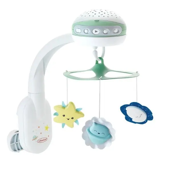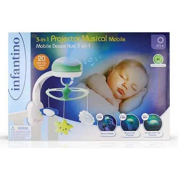 The Infantino 3-in-1 Projector Musical Mobile combines lights, sounds, and interactive hanging toys to create a calming and engaging crib experience. Designed for infants 0 Months+, it features 8 soothing melodies, a smart sound sensor, and colorful hanging toys that stimulate visual and auditory senses while encouraging sensory development.