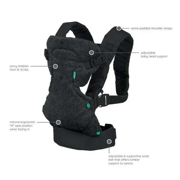Carry baby 4 ways with the Infantino Flip Advanced 4-in-1 Carrier in Black—from newborn (3.6 kg) to toddler (14.5 kg). Switch between front-inward narrow seat, front-outward wide seat, and back carry. Breathable mesh keeps baby cool in UAE heat; adjustable padded straps and waist belt (66–132 cm) ensure parent comfort. Includes Wonder Cover™ bib for drool protection and front zip pocket. Machine-washable, folds compact. EN certified & hip-healthy. Perfect hands-free bonding. Ships in 2 days via YallaBuyIt.ae.