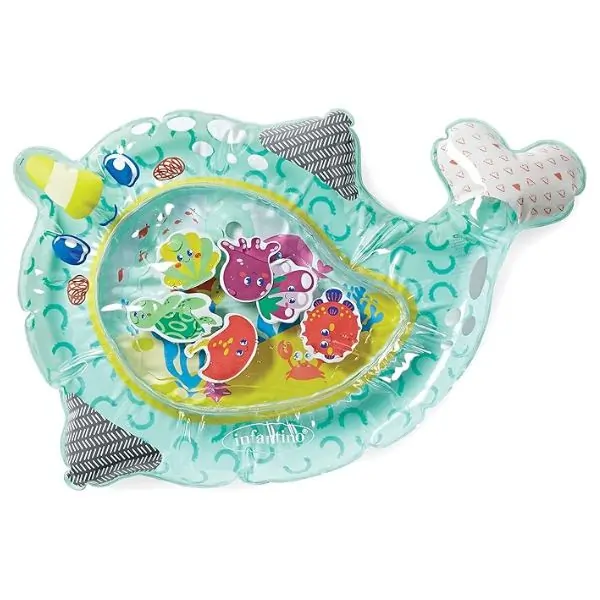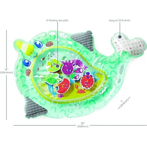 The Infantino Pat & Play Water Mat is a colorful, inflatable floor toy for infants 3 months and older. Designed to encourage tummy time, visual stimulation, and motor skills development, this mat provides hours of safe, sensory-rich play. Babies can pat, roll, and explore the floating water shapes to strengthen hand-eye coordination and fine motor skills.