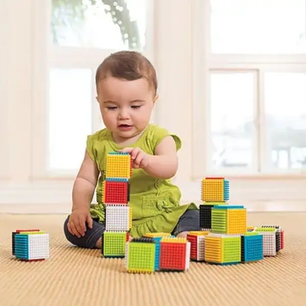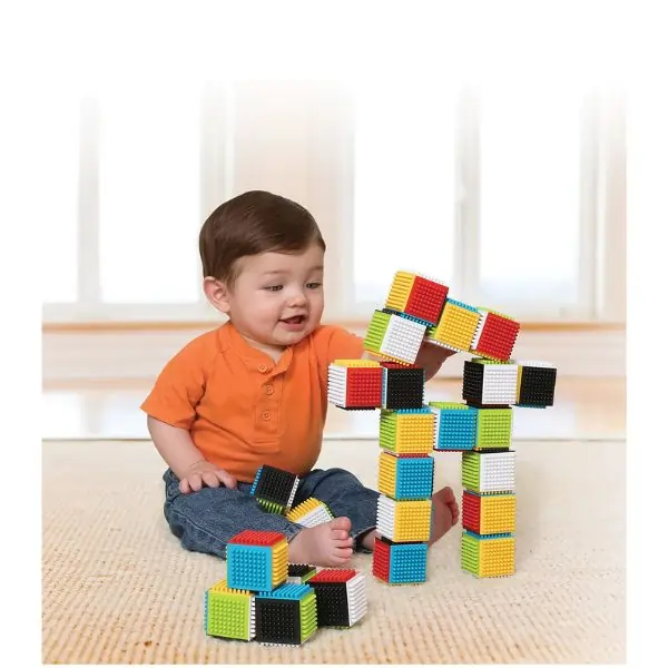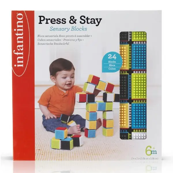 The Infantino Press Stay Sensory Blocks set includes 24 colorful, high-contrast blocks designed to stimulate infant imagination and early motor skills. Perfect for babies 6 months and older, these lightweight blocks stack, press, and stay together, making it easy for little hands to explore and build. Made from safe, durable materials, this building set encourages creative play, problem-solving, and sensory development.