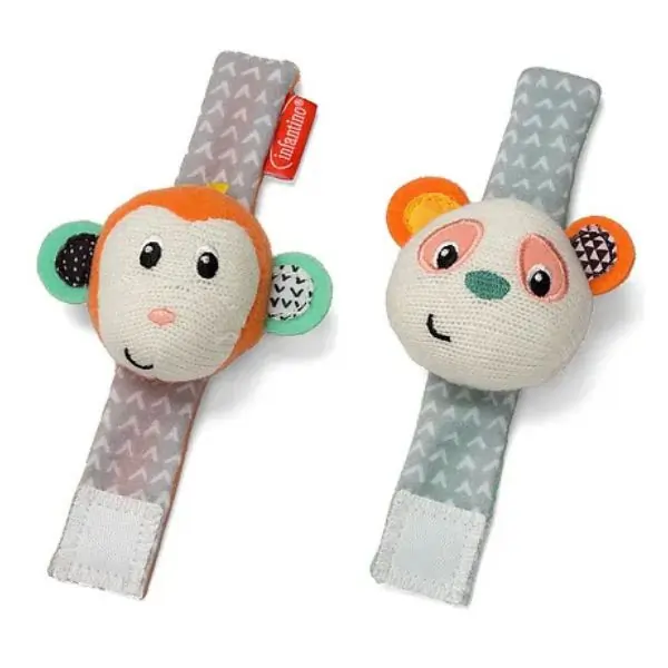 Includes 2 soft plush wrist rattles (Monkey & Panda)