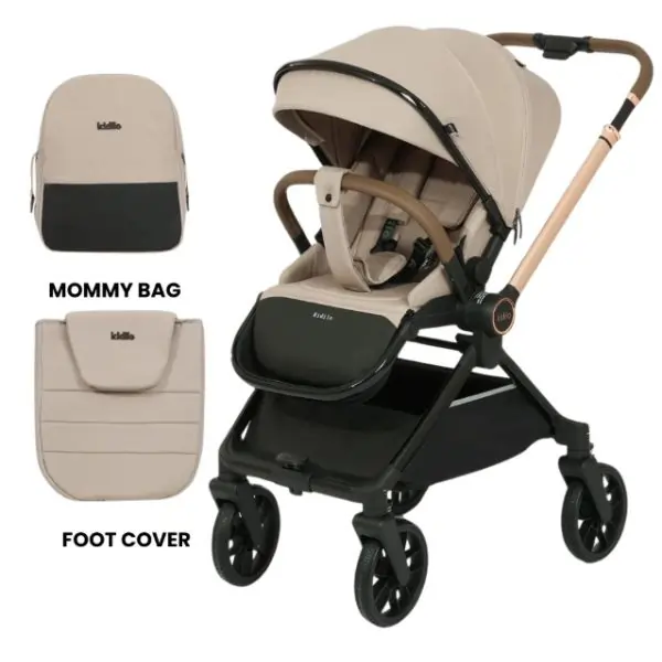 The Kidilo Baby Stroller with Bag & Foot Cover is a stylish and functional stroller designed for comfortable daily outings and smooth travel. Equipped with a double-sided handle, it allows flexible pushing control, while the 360-degree rotating wheels ensure effortless maneuverability across different surfaces. This stroller comes complete with a matching storage bag for baby essentials and a foot cover to provide warmth and protection during cooler weather. Finished in a modern khaki color, it blends premium style with everyday practicality for parents on the move.