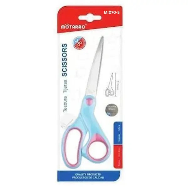 MOTARRO Stainless Steel Scissors (MI070-3). Designed for smooth and accurate cutting, these sharp scissors are ideal for school stationery, office work, craft projects, and home use. The durable stainless steel blades provide clean cuts on paper, card, and lightweight materials, while the comfortable grip supports safe and controlled handling for students, teachers, and professionals.