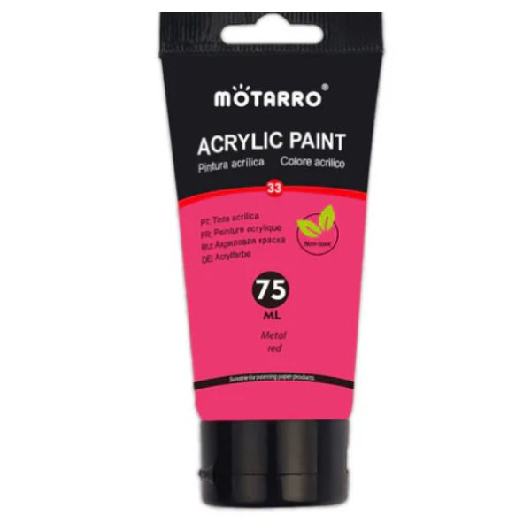 The MOTARRO Acrylic Paint 75ml Metal Red delivers a rich metallic finish with vibrant color intensity, perfect for adding bold highlights and premium effects to your artwork. Formulated for smooth application and excellent coverage, this high-quality acrylic paint is suitable for a wide range of surfaces including canvas, wood, fabric, paper, and craft projects. Its fast-drying, water-based formula allows easy layering and blending while maintaining a striking metallic sheen. Ideal for artists, students, hobbyists, and DIY creators, this metallic red acrylic paint enhances creative projects with depth, shine, and long-lasting color.