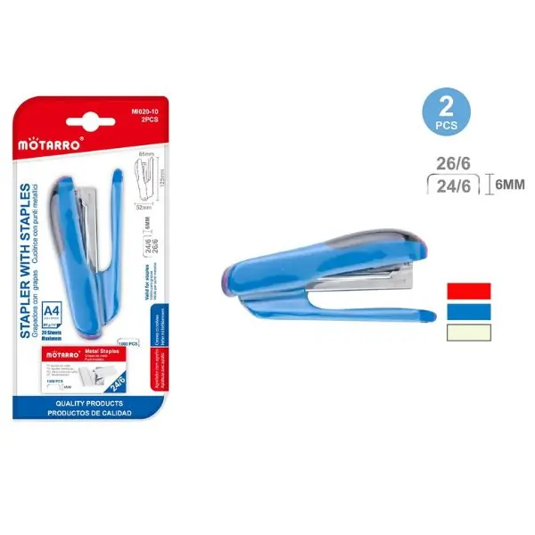The MOTARRO Stapler Set MI020-10 is a reliable and ready-to-use desktop stapling solution designed for efficient paper binding at the office, school, or home. This complete set comes with staples included, allowing immediate use without additional accessories. Featuring a durable construction and smooth stapling mechanism, this stapler ensures clean, consistent fastening of documents such as reports, assignments, notes, and paperwork. Its compact desktop design helps keep workspaces neat while delivering dependable everyday performance.