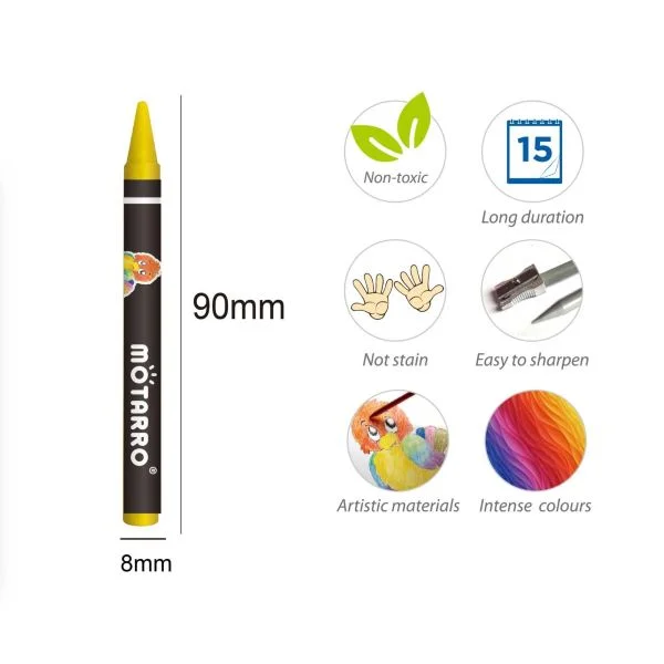 MOTARRO 24-Color Wax Crayons MP013-24—a colorful, kid-friendly set designed to make every drawing bright and fun. This pack includes 24 bold, vibrant colors that blend smoothly on paper, making it perfect for coloring books, school projects, sketching, and everyday art activities. Crafted with a non-toxic, child-safe formula, these crayons ensure worry-free use for young artists. The round-shaped design fits comfortably in small hands, allowing kids to color with ease and control. Each crayon is also easy to sharpen, maintaining a fine point for detailed artwork while staying strong and break-resistant.