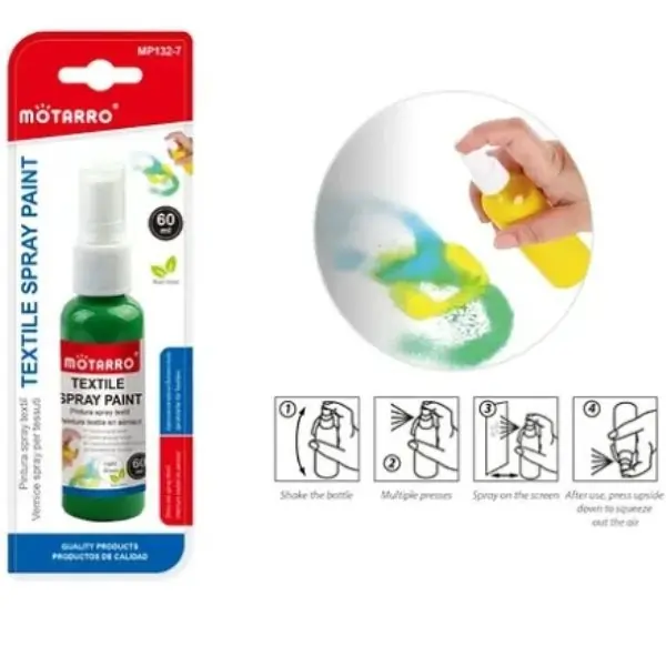 MOTARRO Textile Spray Paint MP132-7. This 60ml fabric color spray is designed to apply smoothly on textiles, making it ideal for clothes, shoes, and DIY crafts. Perfect for quick touch-ups or full design upgrades, it helps you add color, style, and personal creativity to fabric surfaces with easy spray application.