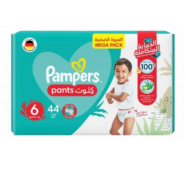 Give your growing baby comfort and protection with Pampers Baby Diaper Pants Size 6 enriched with Aloe Vera lotion for gentle skin care. Designed for babies weighing 16–21kg, these easy-to-wear diaper pants pull on like underwear and provide up to 12 hours of dryness to keep your baby dry day and night. With a soft, breathable fit and stretchy sides, Pampers diaper pants move with your baby for all-day comfort. The Aloe Vera lotion helps protect delicate skin, reducing the risk of irritation and rashes. Ideal for active toddlers, these diapers combine convenience, comfort, and trusted Pampers dryness.