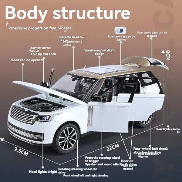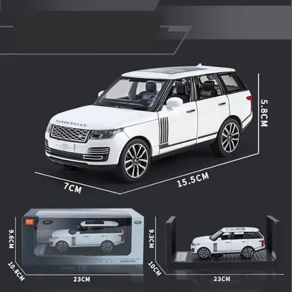 Official Licensed 1:18 Land Rover Range Rover Diecast Model Car is a premium alloy metal SUV replica crafted for collectors and car enthusiasts of all ages. Designed with exceptional attention to detail, this 1:18 scale Range Rover model captures the bold styling and luxury appeal of the iconic SUV. The durable diecast metal body ensures a solid, high-quality feel, while the detailed interior enhances its collector value. Featuring opening doors and interactive sound & light effects, this model offers both display elegance and engaging play. Perfect for showcase collections, office décor, or as a premium gift for kids and adults who appreciate luxury SUVs.