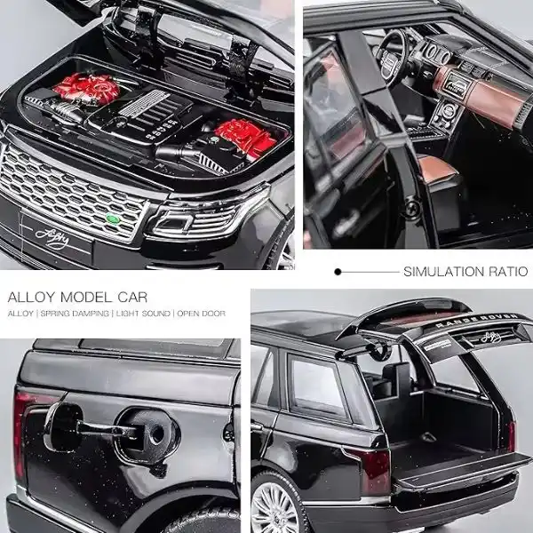 Land Rover Official Licensed 1:24 Range Rover 50th Anniversary Diecast Model Car (Black) is a premium alloy metal replica designed for collectors and luxury SUV enthusiasts. Crafted in a detailed 1:24 scale, this diecast model showcases the elegant styling and iconic design of the Range Rover 50th Anniversary edition. The sleek black finish enhances its bold and premium appearance, making it a standout collectible for display shelves or office décor. Built from high-quality alloy metal, the model includes opening doors and interactive sound & light effects, creating a realistic and engaging experience. With detailed interior craftsmanship, authentic body proportions, and smooth rolling rubber tires, this diecast SUV offers both display value and fun playability. Perfect for collectors, car enthusiasts, and as a premium gift for kids and adults who admire iconic luxury SUVs.