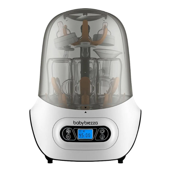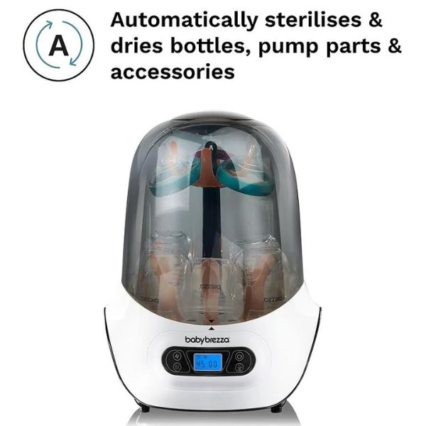 Keep baby gear spotless with the Baby Brezza Bottle Sterilizer and Dryer Machine in white—sterilizes with electric steam (99.9% germ kill) and dries with hot air, fitting 6 bottles, pacifiers, or pump parts from any brand (plastic, glass, silicone). Offers 4 modes (Sterilize & Dry, Sterilize Only, Dry Only, Storage) with a 45-minute full cycle for efficiency. BPA-free, EN certified, with auto shut-off and stainless steel plate for durability. Compact (29.2x21.6x40.6 cm, ~4.5kg) for UAE kitchens, it maintains sterility up to 48 hours. Ships in 2 days via YallaBuyIt.ae. Key Specifications: