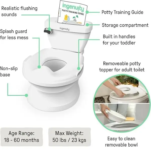 The Summer by Ingenuity My Size Potty Pro helps toddlers transition smoothly from diapers to the real toilet. Designed to look and feel like an adult toilet, it features a realistic flushing sound, removable wipe dispenser, and easy-clean removable bowl for added convenience. Its built-in splash guard keeps messes contained, while the sturdy design ensures safety and comfort for every potty session. Suitable for boys and girls aged 18 to 60 months, it’s a fun, hygienic, and confidence-building potty training solution.