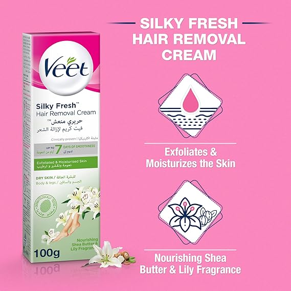 Achieve smooth, soft skin effortlessly with Veet Silky Fresh Hair Removal Cream 100g. Specially formulated for dry skin, this nourishing cream contains shea butter to moisturize while removing unwanted hair from body and legs. The gentle lily fragrance leaves your skin smelling fresh and silky. Quick, easy, and effective, it’s ideal for regular use at home or professional settings. The pack of 12 ensures long-lasting supply for consistent hair care.