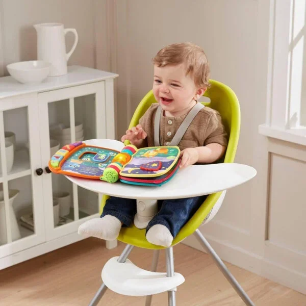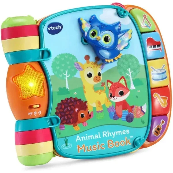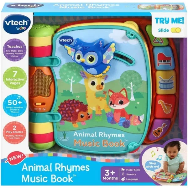 Sing along to 6 favorite nursery rhymes like "Old MacDonald" with the VTech Animal Rhymes Music Book—a colorful interactive book for 1-3 years+ featuring easy-to-turn pages with twists, turns, and slides for hands-on fun. Beautifully illustrated with cute animals, it includes piano keys that play notes, light-up buttons for rhymes and sounds, and animal buttons to learn names. Encourages early literacy, motor skills, and music exploration. EN certified for safety, requires 2 AA batteries (included). Compact and durable for UAE playtime or travel. Ships in 2 days via YallaBuyIt.ae. Key Specifications: